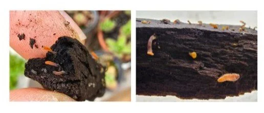 Em dezembro de 2024, mexendo no vaso da Romã eu desviei o olhar por um segundo e fui surpreendida por um pedacinho de madeira, descolado do mesmo banco e que tinha um pequeno conjunto de fungos minúsculos, quase imperceptíveis brotando do fragmento de madeira de no máximo 8 centímetros. Peguei o pequeno tronco, menor do que o meu dedo indicador e o levei para a mesa do ateliê. fiquei ali, olhando pra ele enquanto sentia que ele olhava para mim. Era tão minúsculo que não conseguia imaginar como ele via o mundo, e nem como eu o havia visto ali. talvez tenham sidos os seres encantados que me mostraram em um momento de contemplação delicada do vaso de romã. No início de janeiro ainda estava ali. Um pouquinho menor do que os encontrei da última vez. Segui com eles fotografando, mas mais do que isso sentindo. Tive medo de perde-lo de vista então fiquei ali, olhando, olhando, contemplando até que pudesse senti-lo no meu corpo sem nem precisar vê-lo. As vezes acho que sentir profundamente é sempre poder viver de novo, é como guardar uma memória. se ela estiver no corpo permanece no tempo.
