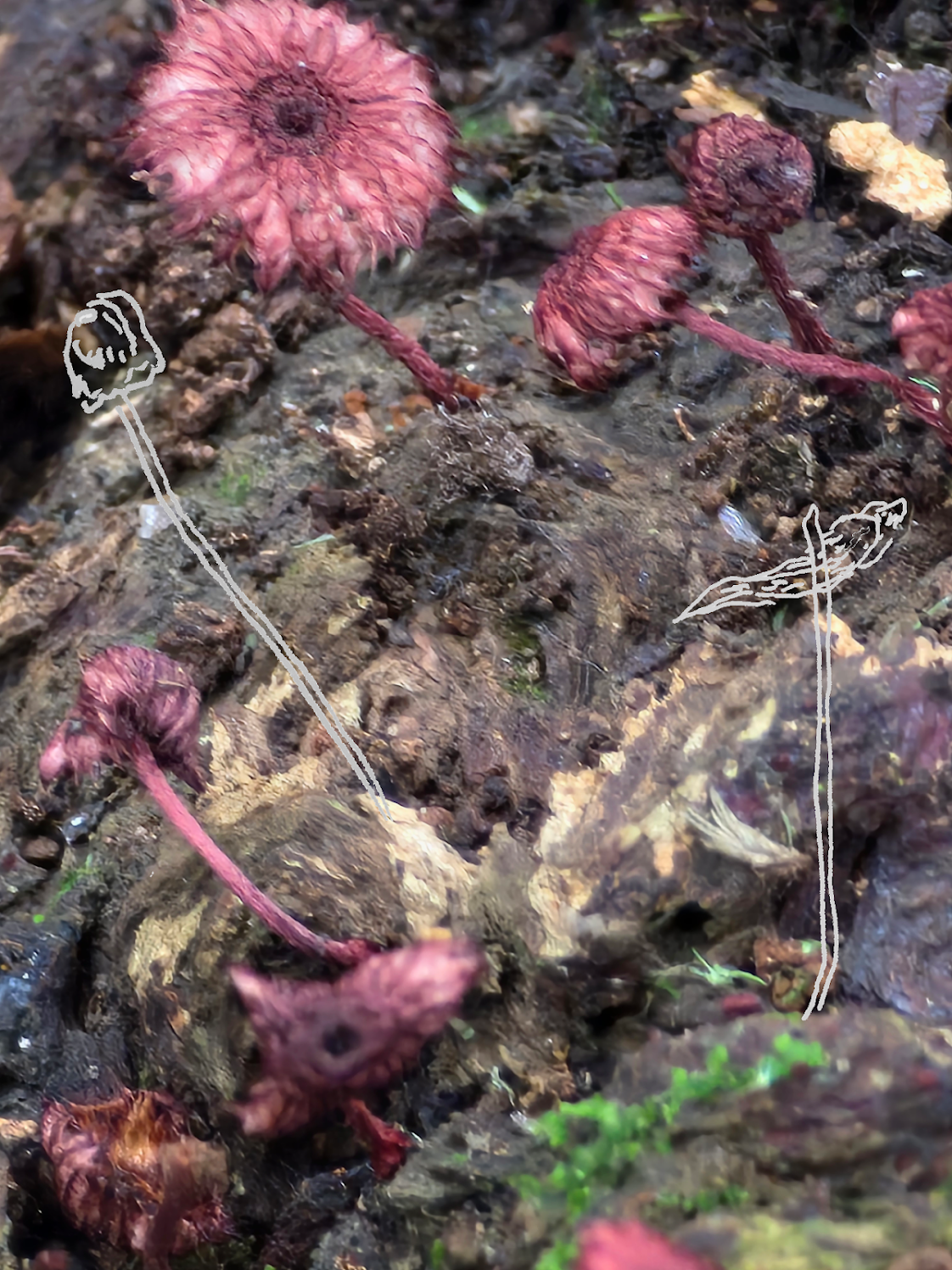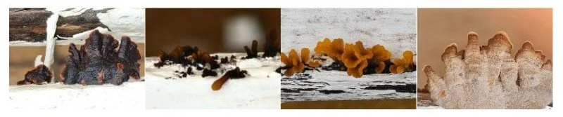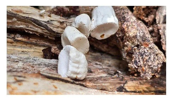 Em março de 2024 tive um encontro incrível com eles na Serrinha. Foi um final de semana e caminhamos muito pela fazenda, em vários horários do dia. Me dei conta que próximo as pedras, haviam uns muito muito pequenos, eram bolinhas em tons de bege escuro e amarelo, presos por uma pequena haste muito fininha, da largura de uma agulha de costura. Quando me lembro deles hoje me pareciam secretos e silenciosos, como nunca havia percebido outros antes. Em um momento de poda e manejo na agrofloresta, percebi a sua presença nos troncos das árvores, em formatos de cone parecendo delicadas linhas repetidas que se assemelhavam a pequenas conchas desenhadas e esculpidas por seres encantados. Eram muitos, esses me pareciam os que escutam os segredos, de ouvidos abertos. Haviam outros parecendo que haviam acabado de sair do fundo do mar como as algas, brancos transparentes. Me fez imaginar que eram habitados por seres encantados. Uma coleção de fungos muito especiais em dias de sol que seguiam os dias chuvosos.