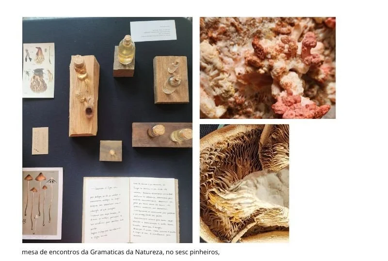 Em outubro de 2023 conheci a pesquisa de fungos da Gramáticas da natureza, da Carolina Coronato e do Vitor Barão, no sesc 24 de maio, em SP. Pude ver os cultivo que eles estavam fazendo, as aproximações que permeavam o campo da arte, da educação e da biologia, criando intersecções nesses campos, que muito me interessam. Além das pesquisas gastronômicas de fermentação feitas pelo Vitor. fico pensando que talvez esse seja um bom lugar para pensar com os fungos, e seres mais que humanos, lugar de convivência, de respeito e aprendizagem em um limiar delicado, sem excessos. Pude observar isso também em uma mesa apresentada por eles no Sesc pinheiros em 2024.
