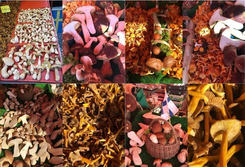 No mesmo período fomos a Estocolmo, Suécia, e em uma feira de rua, além de uma variedade enorme se flores gigantes tinha uma banca de fungos de cores a tamanhos diferentes. Ali pude também ter a dimensão do mercado de cogumelos e fungos. impressionante pensar como se transforma uma espécie em mercadoria com tanta facilidade. Os cogumelos matsutakes são muito utilizados no Japão para longevidade e até cura de doenças como câncer, e custam uma fortuna, um cogumelo pode custar 20 euros e um quilo até 2000 euros. eu sempre me lembro dos indígenas falando sobre como tudo na cidade vira mercadoria. eu fico pensando em como nós que vivemos nas cidades desaprendemos a nos conectar com as plantas, seres mais que humanos e passamos a pensar a forma de comer, de se alimentar a partir dos ciclos de organização do mercado, das imposições de tempos em que se consomem as coisas que as grandes produtoras se interessam em nos oferecer, nos grandes mercados. existem cogumelos e fungos que custam mais de 20.000 e 30.000 reais, pode imaginar? para quem servem esses luxos? fora as trufas brancas que se leiloadas podem custar números de muitos zeros. a minha relação com os fungos e cogumelos é tão antiga, e se tantas ordens, menos a monetária, que embora me entristeça pensar nessas questões, acho importante pontuar como um lugar de reflexão de como somos impelidos a construir pensamentos de privilégio e nos gabarmos de termos condições de tal consumo enquanto a maior parte das pessoas do mundo passa fome. costumo olhar para um lugar no qual as coisas possam ficar em um meio termo, nem muito lá nem muito cá. esse é o desafio dos dias de hoje, encontrar caminhos que possam nos fazer refletir e ao mesmo tempo nos posicionarmos de forma ativista e delicada.