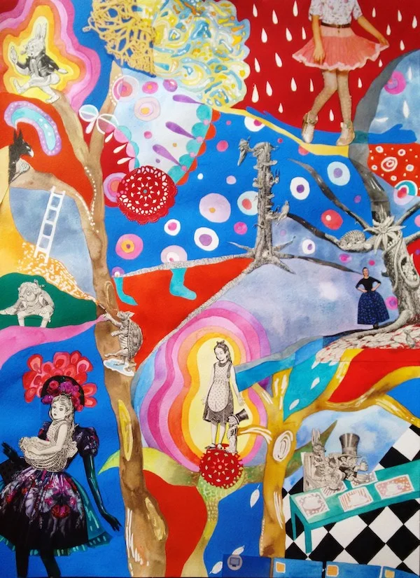 Encontros com Alice, 2015. Aquarela, gouache, recortes de revista e de livros antigos, renda de papel, impressão adesiva e papel. 76x56cm, Coleção da artista